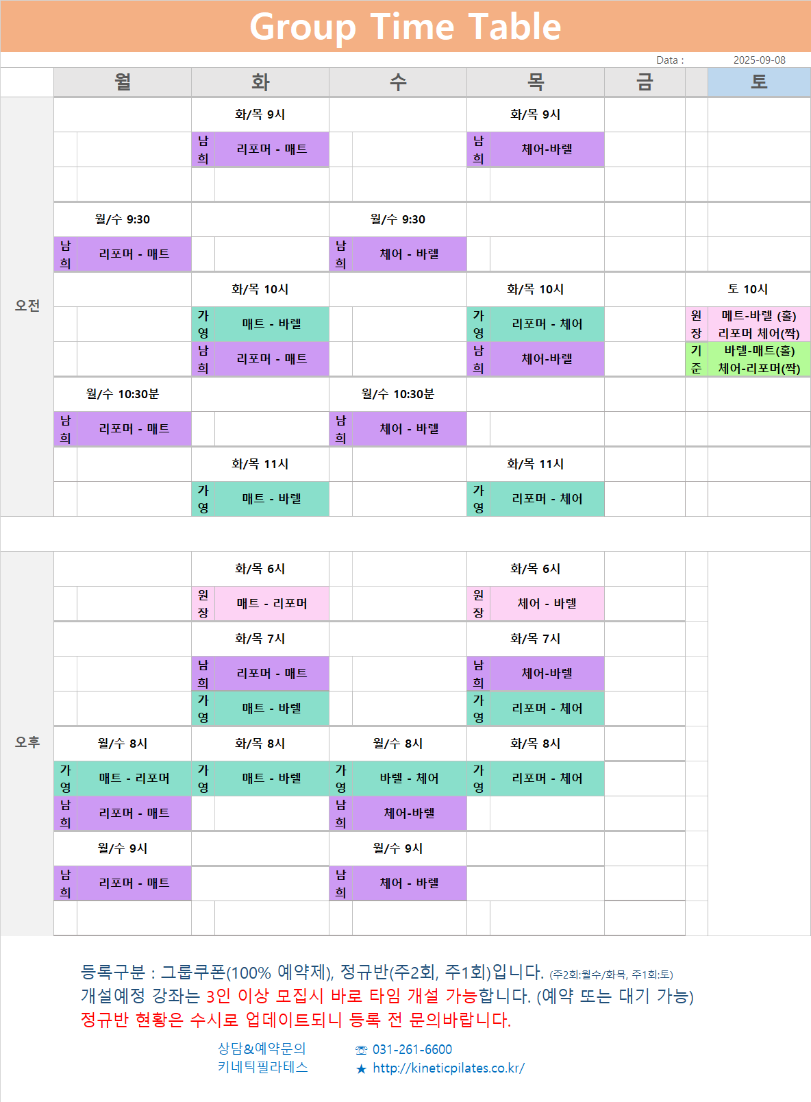 그룹레슨은 총 55분 수업으로 진행되며 유산소그룹과 일반그룹으로 구분됩니다.